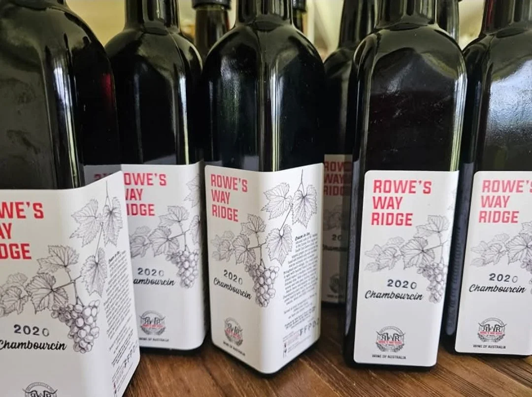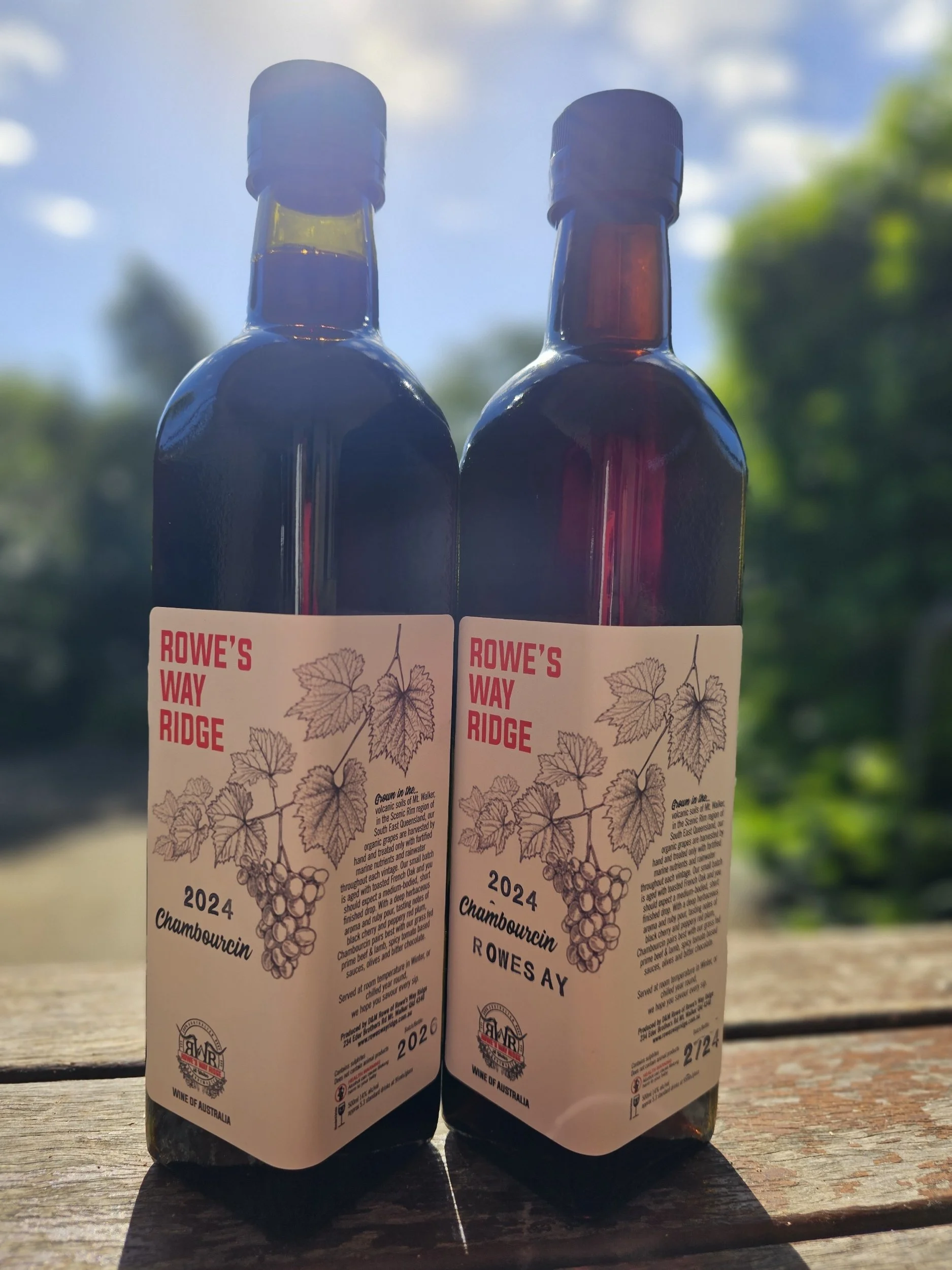 “Grown in the volcanic soils of Mount Walker, in the Scenic Rim region of South East Queensland, our organic grapes are harvested by hand and treated only with marine nutrients and rainwater throughout each vintage. Our small batch is aged with toasted French Oak and you should expect a medium-bodied, short finished drop. With a deep herbaceous aroma and ruby pour, tasting notes of black cherry and peppery red plum, Chambourcin pairs best with our grass fed prime beef, spicy tomato based sauces, olives and bitter chocolate. Served at room temperature in the winter or slightly chilled year round, we hope you savour every sip - just like we do.” ~ from our label